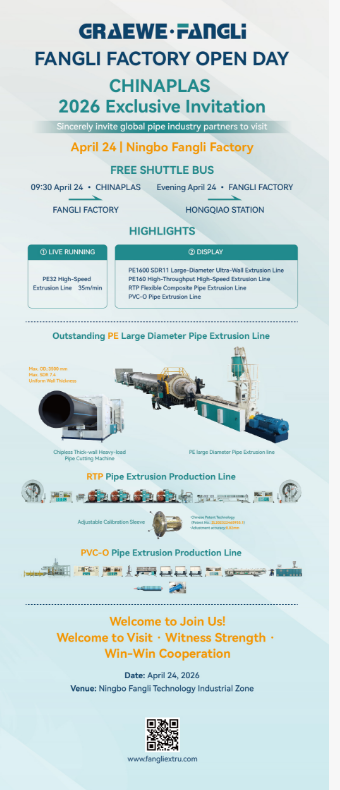 Április 21. és 24. között a CHINAPLAS 2026 kiállításon látogassa meg a Fangli Technologyt a 7.1C14-es standon. Fedezzük fel együtt az innovációt és a jövőbeni együttműködést a műanyagcső-berendezések terén!
